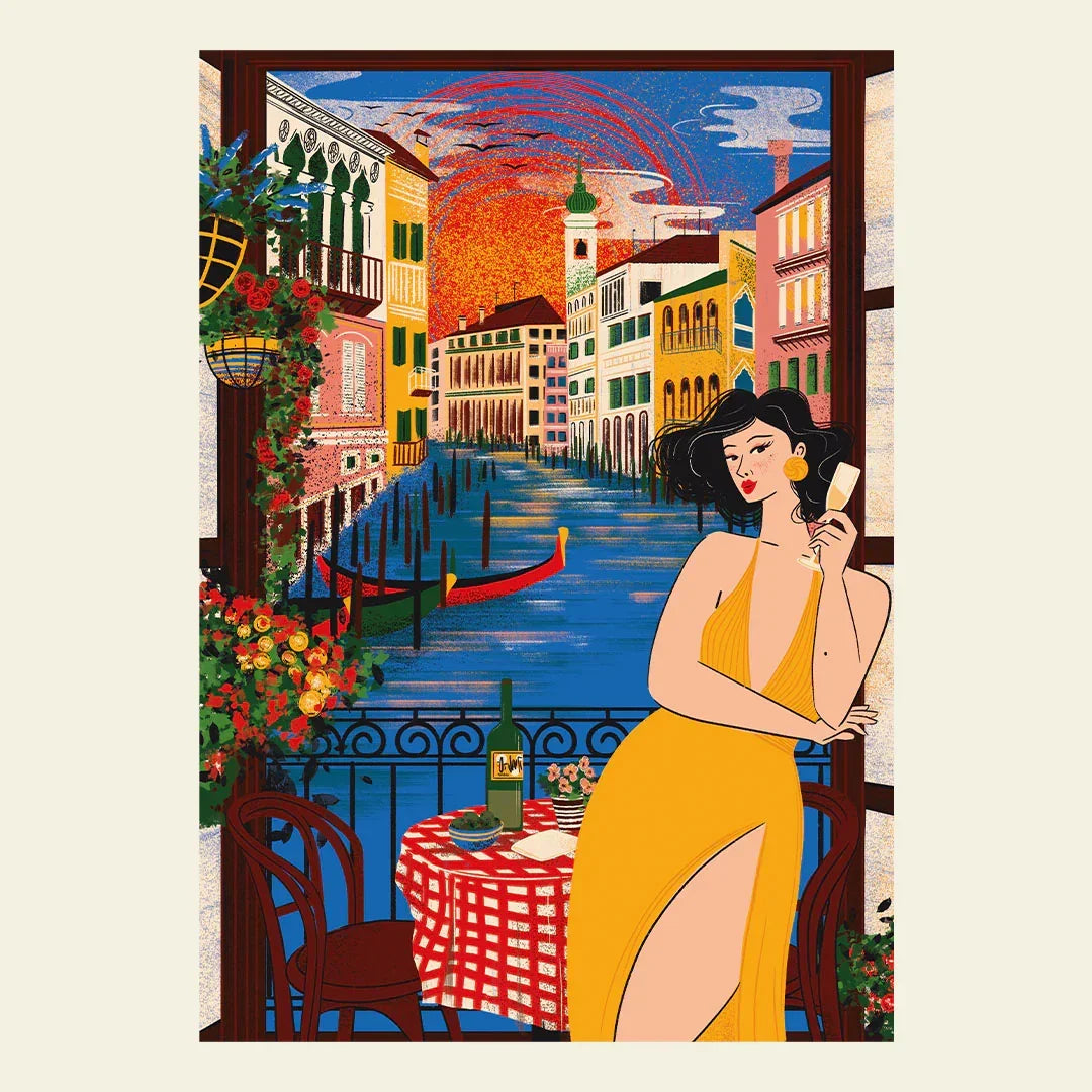 Det fortæller om et øjeblik af forventning, elegance og længsel: en kvinde med et glas prosecco, mens Venedig i baggrunden farves af solnedgangens intense nuancer. Canal Grande flyder langsomt forbi, en gondol skimtes i det fjerne, og luften synes fyldt med løfter. Hver detalje — fra det dækkede bord til vinflasken, fra de venetianske paladser til hovedpersonens gådefulde udtryk — fortæller en historie, man selv kan forestille sig.