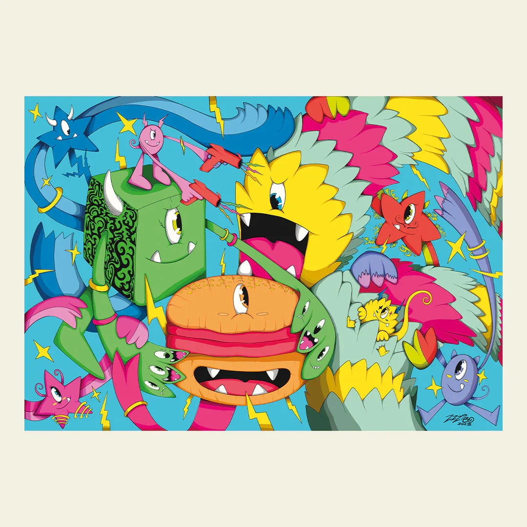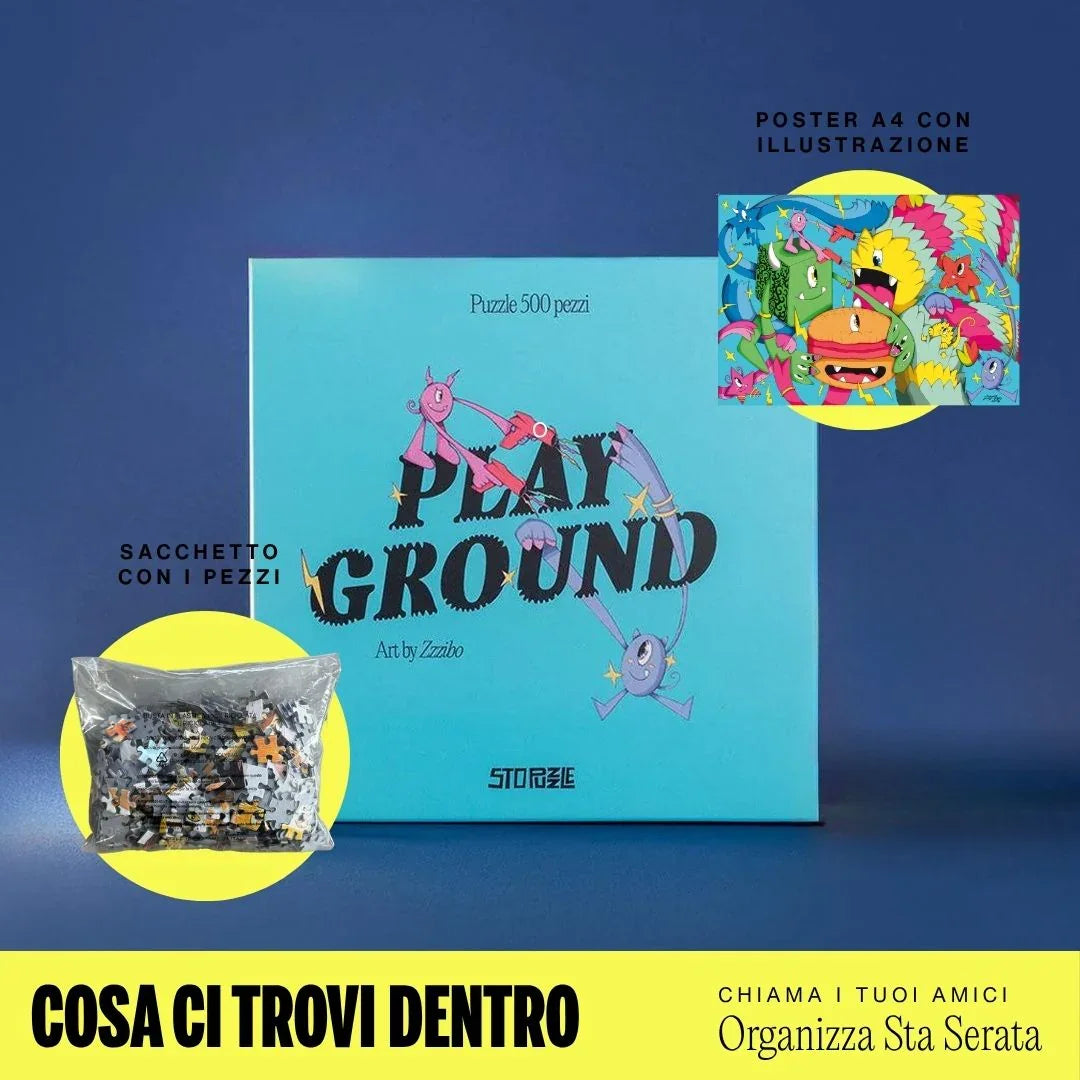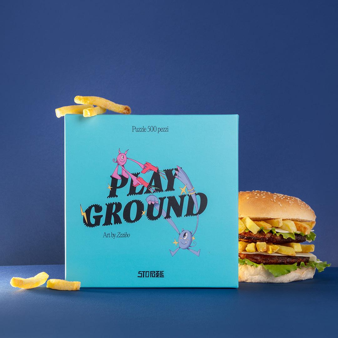 En eksplosion af energi venter jer med "Playground" af Zzzibo! Dette puslespil med 500 brikker og målene 35 × 50 cm er en ægte farve- og fornøjelsesbombe, der får jer til at rejse tilbage i tiden. Det minder om dagene, hvor du løb, hoppede og legede uden bekymringer på legepladsen sammen med disse små monstre i alle former og størrelser, som konkurrerer om en lækker hamburger midt i scenen.