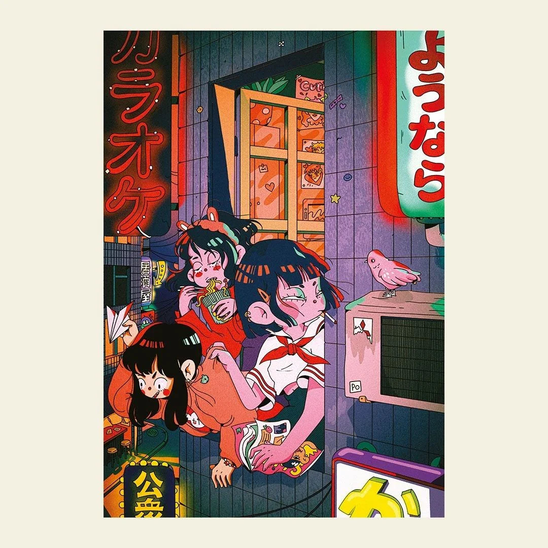 Illustrationen skildrer tre unge kvinder, der befinder sig i en urban atmosfære, som blander ironi, nostalgi og modernitet. Blandt instant ramen, oplyste reklameskilte og en nysgerrig fugl fortæller hver brik en historie, der bare venter på at blive opdaget.