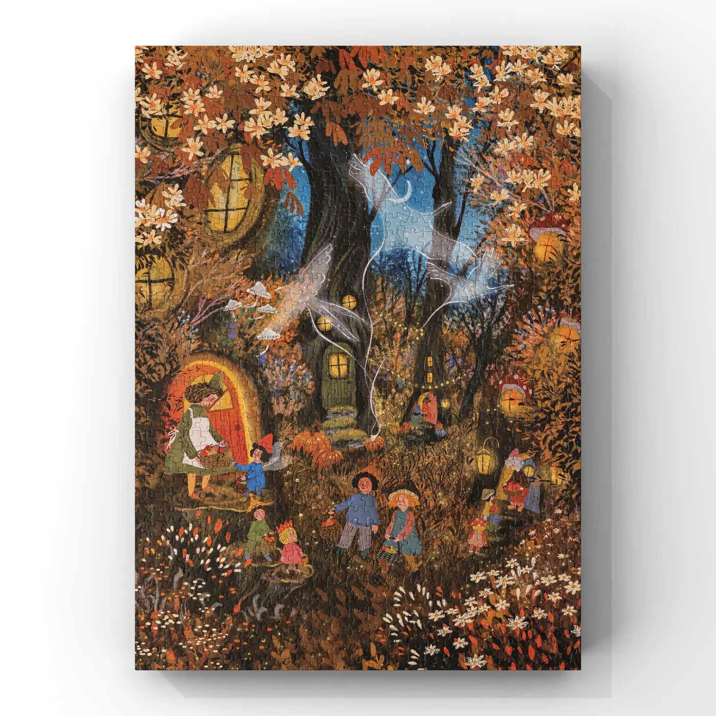 Træd ind i en fortryllende efterårsskov, hvor varmt lanterne lys, skovhjem og vandrende ånder bringer natten til live. Denne rigt detaljerede illustration fanger en magisk verden af børn, skabninger og skjulte historier—perfekt for puslespillere, der elsker finurlige, atmosfæriske scener. Det 1000-brikkers puslespil er en tilfredsstillende udfordring for dedikerede puslespillere, med præcisionsskårne brikker, der passer perfekt sammen.