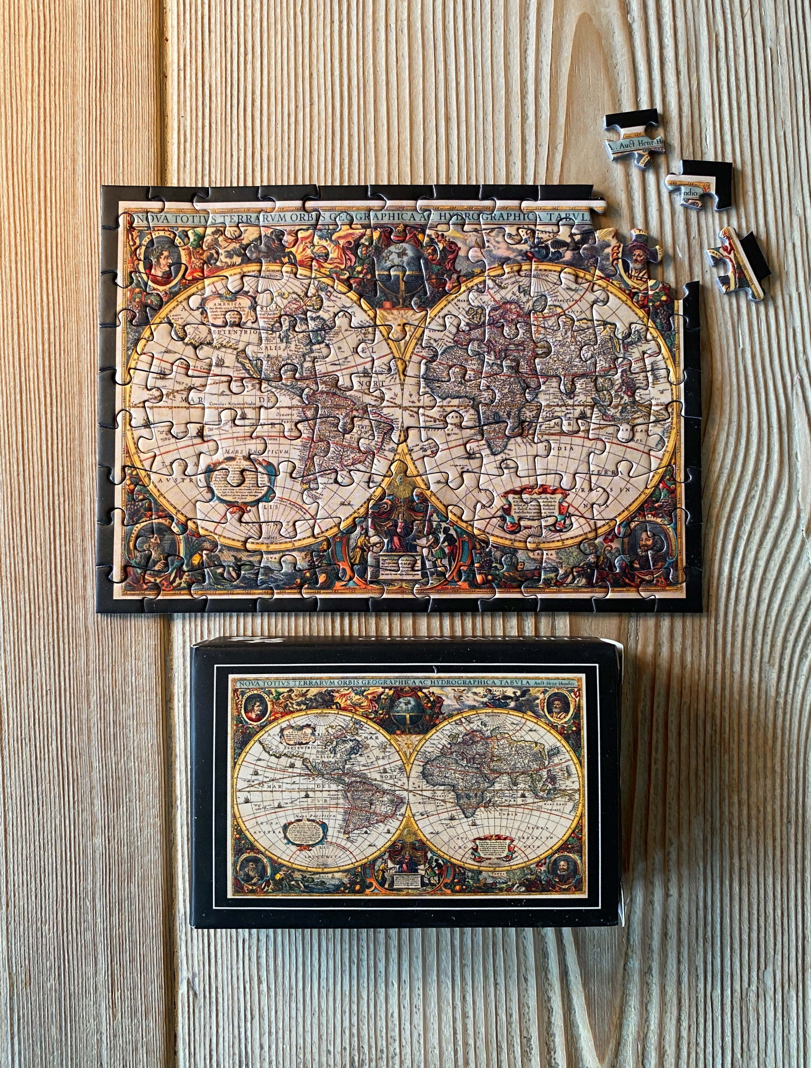 Ein wunderschönes Minipuzzle mit 99 Teilen und einer alten, dekorativen Weltkarte als Motiv. Die warmen Farben und die vielen feinen Details machen dieses kleine Puzzle zu einem ganz besonderen Vergnügen.