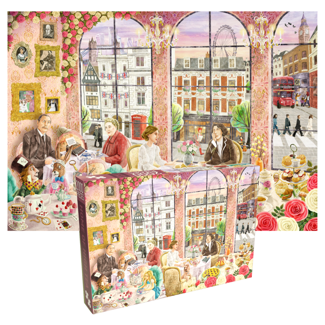 Læg det flotte London-puslespil, Home of High Tea, fra danske Penny Puzzle, med 2000 brikker. Home of High Tea er en invitation til High tea salonen. hvor britisk tradition møder moderne storbystemning. Bordene er overdådigt dækket med smuk porcelæn og de lækreste kager, præcis som du kan forvente dig i London.